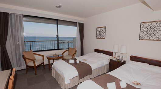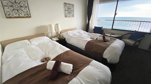 28㎡の広めのツインベッドルームです。 朝日と太平洋の景観を独り占めの広いバルコニー付。2〜3名様でご利用頂けます。