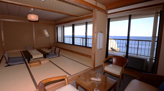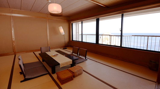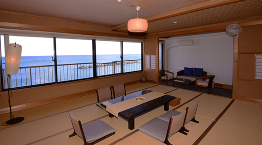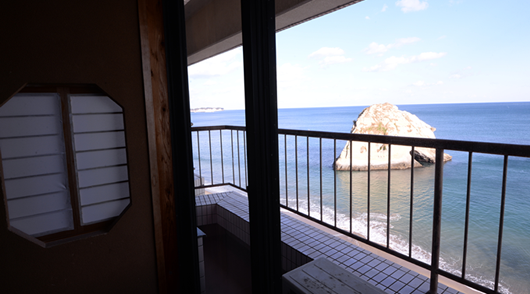 大きな窓からは、太平洋常陸灘の水平線、夜はライトアップされる磯原海岸のシンボル「二ツ島」が直ぐ目の前に見え、ベッドや布団に寝転ぶと、まるで海の上にいるように感じる事ができます。