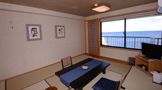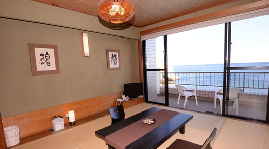 大きな窓からは、太平洋常陸灘の水平線、夜はライトアップされる磯原海岸のシンボル「二ツ島」が直ぐ目の前に見え、ベッドや布団に寝転ぶと、まるで海の上にいるように感じる事ができます。